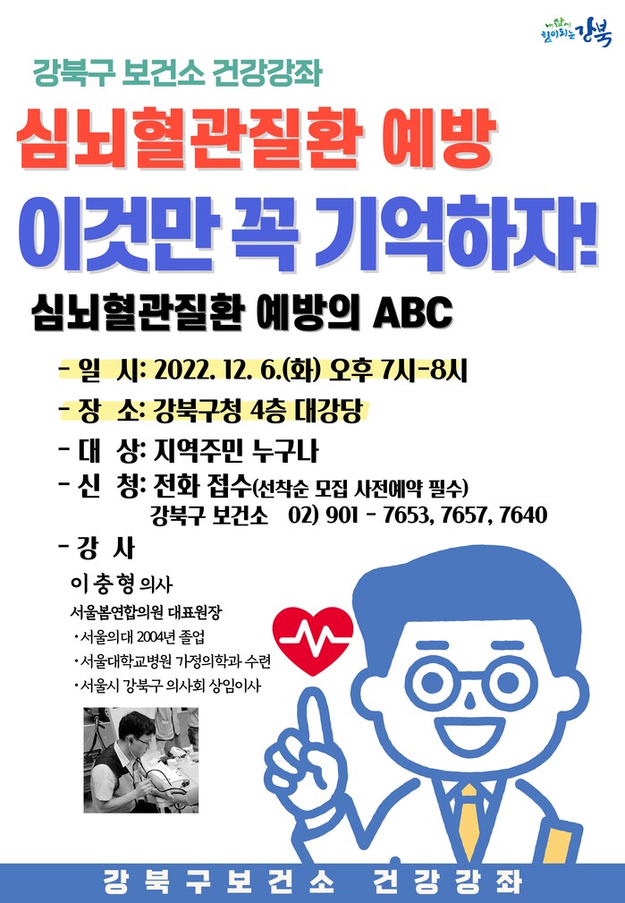 오는 12월 6일(화) 오후 7시 강북구청 4층 대강당에서 진행되며, 강북구 서울봄연합의원 원장이자 강북구 의사회 상임이사인 이충형 가정의학과 전문의가 강연을 맡는다.