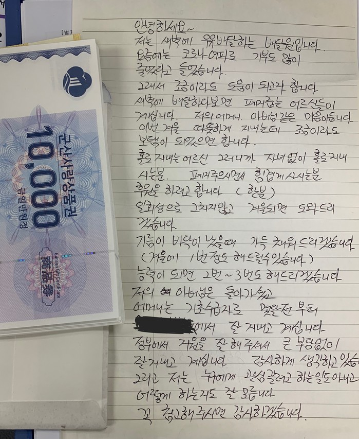 12일 시에 따르면 지난 10일 모자를 눌러쓴 한 남성이 군산시 복지정책과에 찾아와 봉투를 전달했다. 봉투 안에는 편지와 함께 군산사랑상품권 30만원과 현금 5만원이 들어 있었다.