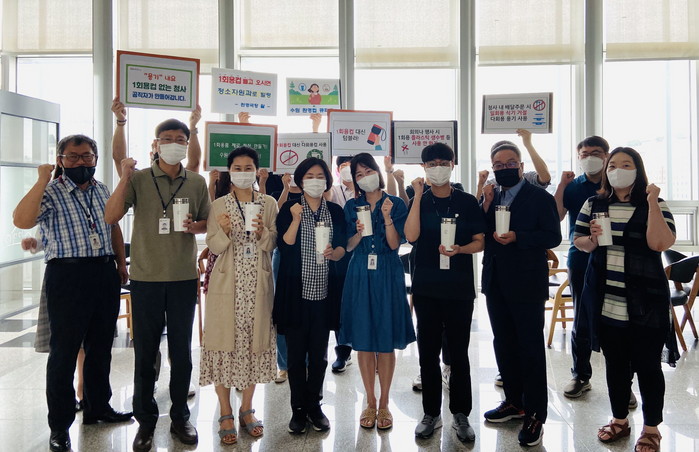 | ▲수원시 청소자원과 직원들이 ‘1회용품 없는 청사 만들기’를 실천할 것을 다짐하고 있다. 수원시 제공 |