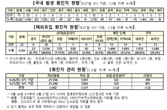 질병관리청 중앙방역대책본부(본부장:정은경 청장)는 27일 0시 현재, 국내발생 신규 확진자는 73명이 확인됐고, 해외유입은 22명이 확인돼 총 누적 확진자수는 2만3611명(해외유입 3183명)이라고 밝혔다.