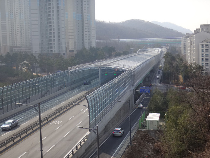 17일 시에 따르면 1년 7개월간 사업비 155억원을 투입해 운중동 두밀지하차도부터 생태터널 구간까지 터널형(길이 386m)과 직립형(길이 60m) 방음 시설이 8m 높이로 세워졌다.