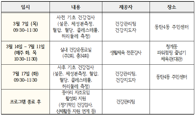 운영기간은 이달 14일을 시작으로 오는 7월 17일까지 총 63회에 걸쳐 진행되며 동탄4동 실내체육관에서 매주 화·목요일 오전 10시 30분부터 낮 12시에 실시된다.