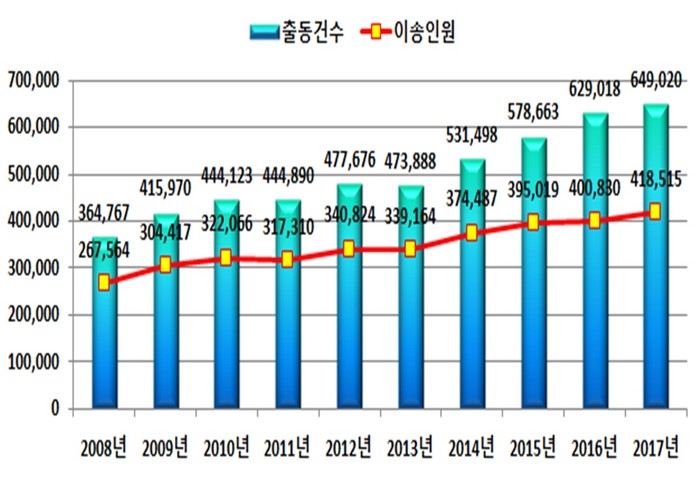 이 가운데 실제 이송건수는 40만8745건으로 2016년 40만830건 대비 2%, 이송인원은 41만8515명으로 2016년 41만953명 대비 1.8% 증가했다.