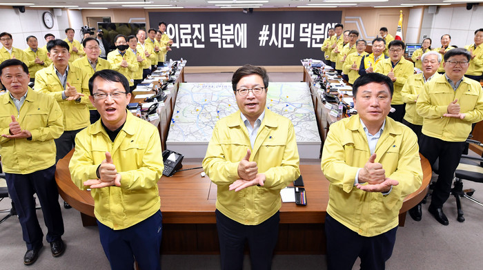 염태영 수원시장과 간부 공직자들은 지난달 29일 확대간부회의를 마치고 ‘덕분에 챌린지’에 참여하며 코로나19 대응에 함께해준 모든 이에게 고마움을 전했다. ‘덕분에 챌린지’는 코로나19 환자 진료에 힘쓰고 있는 의료진을 응원하는 캠페인이다.
