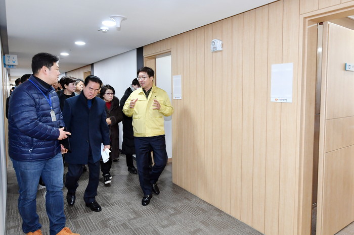 | ▲수원시가 기초지방자치단체 중 최초로 임시생활시설로 운영한 수원유스호스텔을 염태영 수원시장이 점검하고 있다.(2020년 2월17일) |