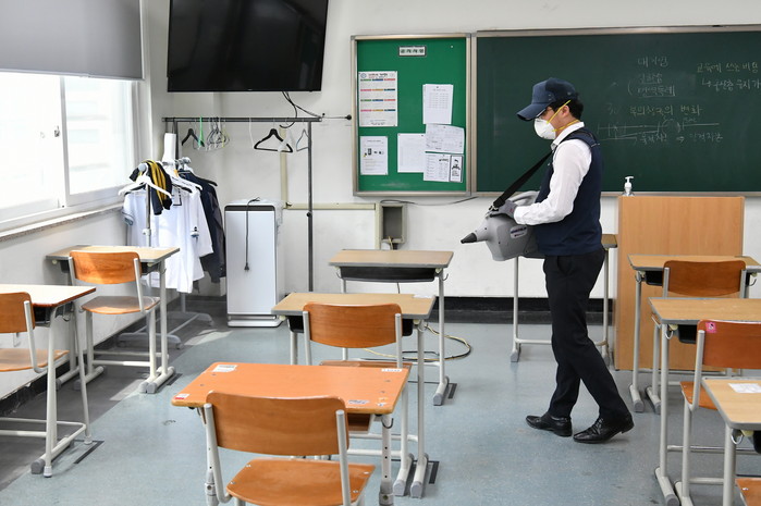 | ▲지난해 5월 등교 개학을 앞두고 수원시내 한 고등학교에서 방역이 진행되고 있다. |