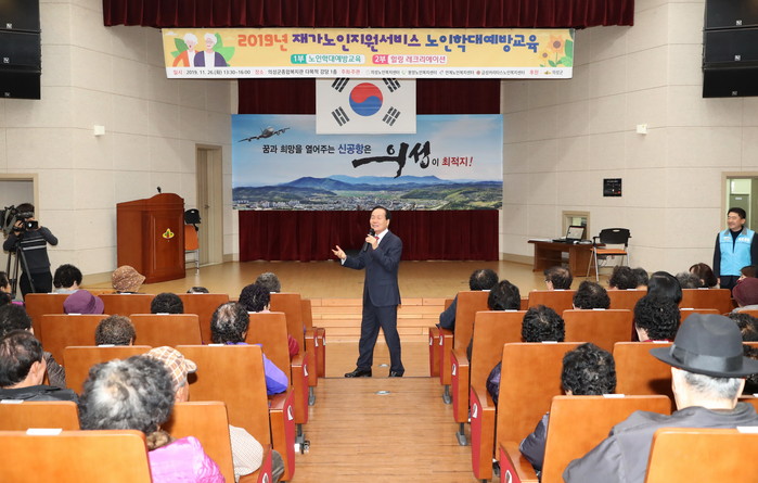 | ▲김주수 군수가 지난 26일, 의성군종합복지관에서 재가노인복지센터 4개소 서비스 대상자 90여명이 모인 가운데 어르신 집합교육을 진행하고 있다.(의성군 제공) |