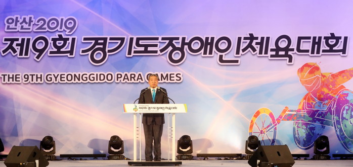▲송한준 경기도의회 의장이 지난 23일 ‘2019 제9회 경기도장애인체육대회 개회식’에 참석해 인사말을 하고 있다.(경기도의회 제공) |