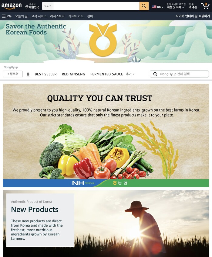 ▲ NH농협무역은 7일 미국시장 수출 활성화와 온라인 무역 확대를 위해 미국 인터넷 종합 쇼핑몰 아마존에 농협 브랜드샵을 공식 오픈하고 된장, 고추장, 홍삼 등 농협우수가공제품 판매를 시작했다. NH농협무역 제공 |