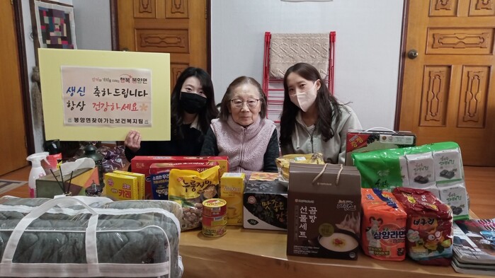 이날 행사는 봉양면 찾아가는보건복지팀에서 준비한 과일, 곰탕, 이불, 유제품 등을 집으로 직접 배달하여 생신을 맞은 어르신들의 안부를 확인하고 만수무강을 기원했다.
