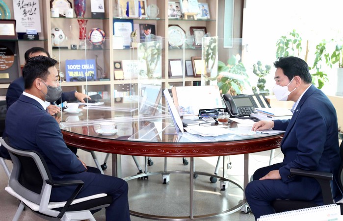| ▲백군기 용인시장이 1일 2022년 경기도종합체육대회 홍보대사로 위촉된 여홍철 경희대학교 교수와 이야기를 나누고 있다. |