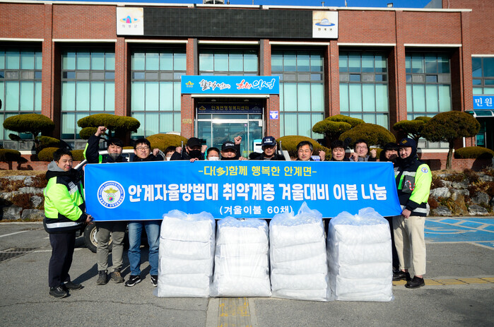 이종우 안계면장은 “안계면 내 저소득 취약계층을 위해 이불을 기부해 주신 자율방범대에 감사하며, 나눔문화가 우리지역에 정착돼 더불어 사는 사회가 되길 바란다”고 말했다.