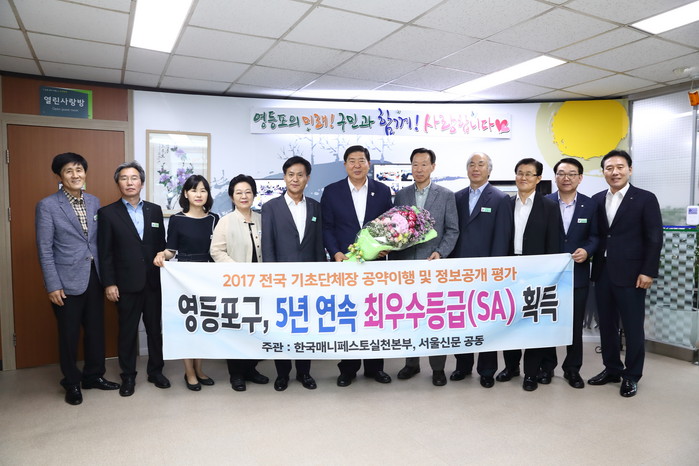 [로컬세계 이명호 기자]서울 영등포구는 조길형 구청장이 한국매니페스토실천본부가 발표한 ‘민선6기 전국 기초단체장 공약이행 및 정보공개 평가’에서 5년 연속 최고등급인 최우수등급(SA)을 받았다고 4일 밝혔다.