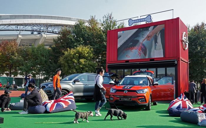 ▲쌍용차는 지난 20~21일 안산 와스타디움 보조 경기장에서 열린 ‘2018 안산 금수저 대잔치’를 공식 후원하고 펫 페스티벌을 진행했다. 2019 티볼리와 G4 렉스턴을 전시한 쌍용 어드벤처 베이스캠프 방문객들이 차량을 살펴 보고 휴식을 취하고 있다.(쌍용차 제공) |