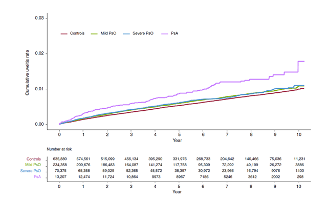 ▲[그림] 건선 중증도 및 유형에 따른 시간별 포도막염 발병 위험도(비건선 환자부터 경증 건선, 중증 건선, 건선관절염 순서로 포도막염 발병 위험이 높다) *Controls : 비건선 환자(대조군) / PsO : 건선 / PsA : 건선관절염 |