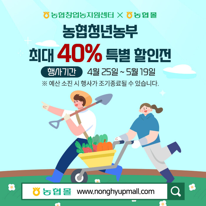 농협경제지주와 농협창업농지원센터는 청년농부 집중 육성의 일환으로 내달 19일까지 농협몰에서 '농협청년농부 특별할인전'을 진행한다.