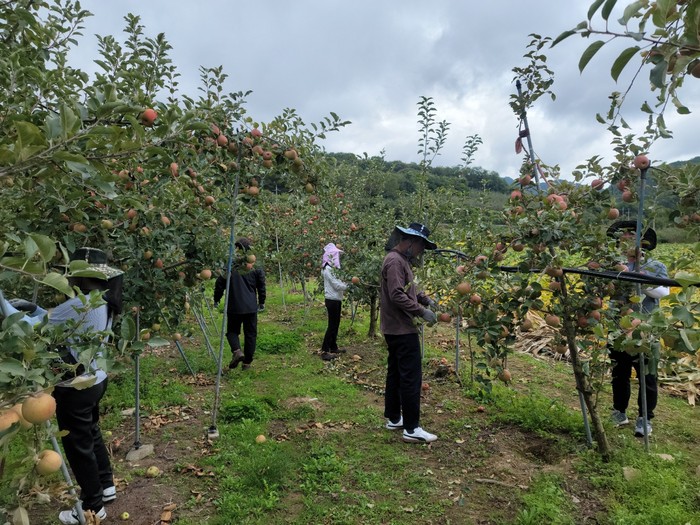 첫 번째 주자로 총괄부서인 농축산과 직원 10여 명은 지난 6일 옥산면 실업리에 위치하고 고령으로 몸이 불편한 여성 독농가의 사과농장에서 잎소지 작업을 지원하며 소통과 봉사의 시간을 가졌다.