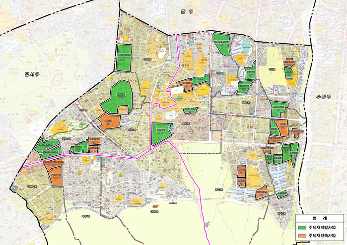 남구 내 재개발·재건축 등 주택정비사업이 활기를 띠고, 앞산봉덕 영무예다음(622세대), 앞산비스타 동원(431세대), 교대역 하늘채 뉴센트원(975세대), 대명역 센트럴 리슈빌(1,051세대) 등 4개소가 건축 중에 있어 향후 2~3년 내 3,079세대가 늘어날 것으로 보인다.