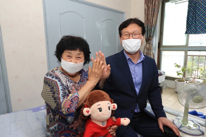 | ▲김대권 수성구청장이 지난 28일 어르신가정을 방문해 효도토이봇 효순이를 직접 전달한 후 안부를 확인하고 있다. |