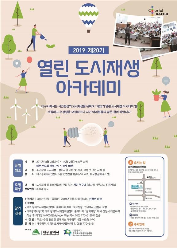 열린 도시재생 아카데미는 시민 역량강화와 다양한 참여 기회 제공으로 시민중심 도시재생 실현과 도시재생 관련 주체들 간 거버넌스를 구축해 도시재생 정책의 지속적 추진이 가능토록 하는 대구의 대표적인 시민참여 프로그램이다.