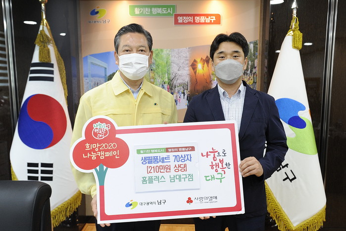 [로컬세계 박세환 기자]대구 남구청(구청장 조재구)은 지난 26일, 홈플러스 남대구점(점장 류주열)에서 코로나19 장기화로 어려움을 겪고 있는 남구 주민들을 위해 210만원 상당의 생필품세트(3만원 상당) 70박스를 전달했다고 29일 밝혔다.