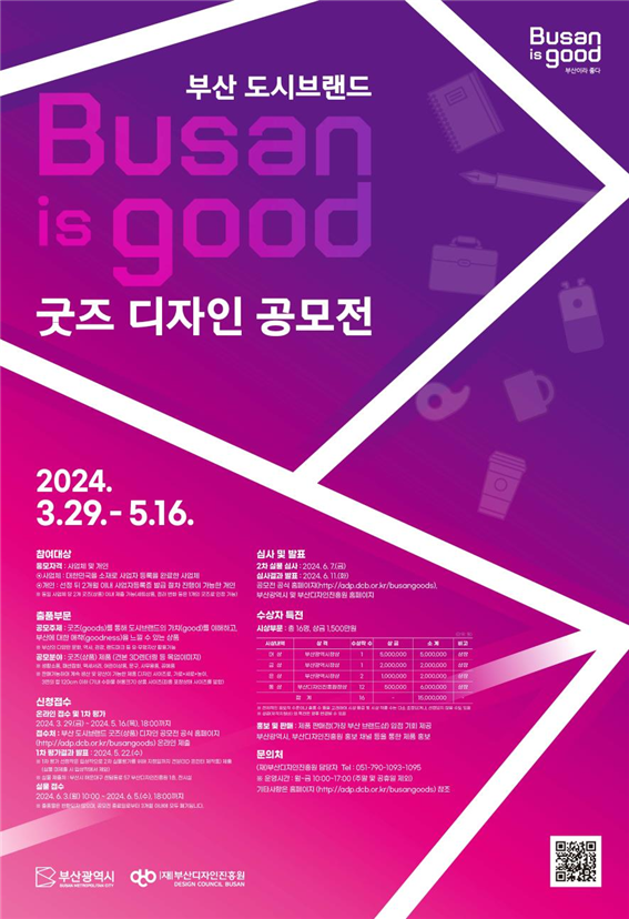 이번 공모전은 부산의 새로운 도시브랜드의 심벌마크와 브랜드슬로건(부산이즈굿)을 활용해 삶의 질이 높은 ‘시민행복도시’, 문화·비즈니스·관광이 조화를 이루는 ‘글로벌 허브도시’ 등 부산의 가치를 담은 굿즈를 개발·발굴하기 위해 진행된다.