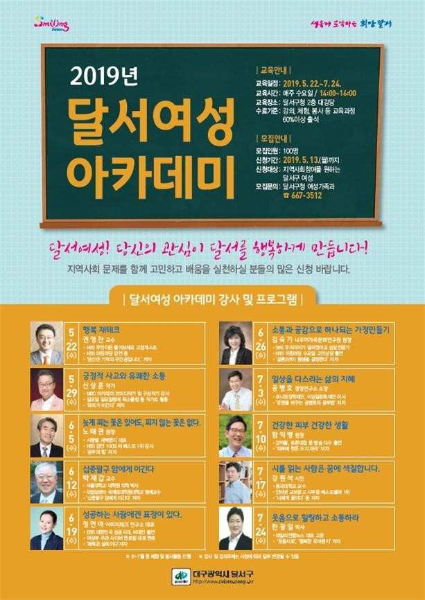 달서여성아카데미 강사 및 강의 주제로는 △KBS 무엇이든 물어보세요 고정게스트 권영찬 교수의 ‘행복 재테크’ △신상훈 작가의 ‘긍정적 사고와 유쾌한 소통’ △‘공부의 힘’ 저자 노태권 원장의 ‘늦게 피는 꽃은 있어도, 피지 않는 꽃은 없다’ △서울대학교 대학원 의학 박사 박재갑 교수의 ‘십중팔구 암에게 이긴다’ △정연아 이미지테크 연구소 대표의 ‘성공하는 사람에겐 표정이 있다’ 등 다양한 주제의 유익한 강의를 이어갈 예정이다.