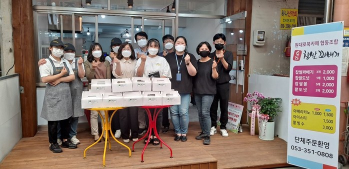 [로컬세계 박세환 기자]대구 서구는 원대로북카페협동조합에서 운영하는 마을기업 '원대찹쌀꽈배기'에서 1~ 4일까지 개업주간을 맞아 관내 복지관련 기관인 제일종합사회복지관, 미래엔미소클럽, 북구노인전문기관, 지역아동센터 2개소, 정다운 재가노인돌봄센터에 30만원 상당의 꽈배기를 전달했다고 2일 밝혔다.