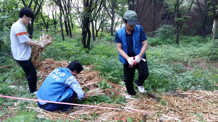▲동작구 관계자들이 마늘대를 재활용한 친환경 방역을 실시하고 있다. |