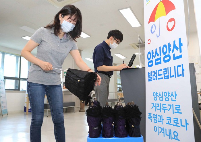 | ▲수성구청 민원실에서 대여 중인 양심양산을 주민들이 이용하고 있다.(수성구 제공) |