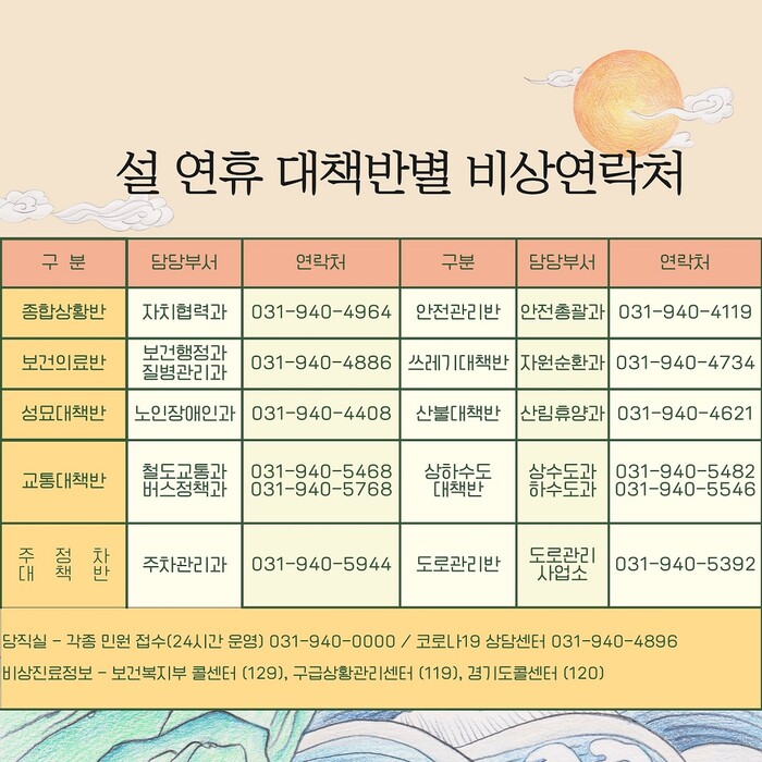 연휴기간 비상진료 상황실, 24시간 응급의료시설 4개소, 응급 분만시설 2개소 및 당직의료기관과 휴일지키미 약국을 지정 운영해 빈틈없는 연휴 비상진료대책을 추진한다.