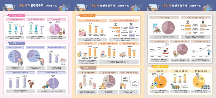 ▲ 용인시 노인등록통계 인포 그래픽(건강, 복지, 소득, 일자리, 안전) |