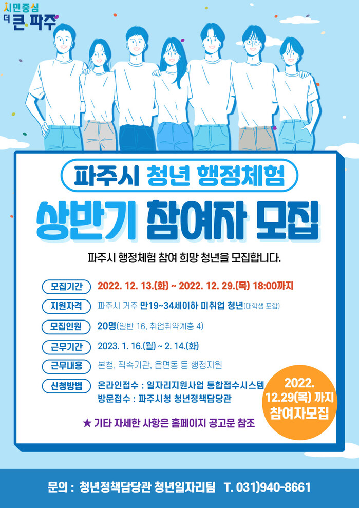 [로컬세계 = 이영원 기자]경기 파주시(시장 김경일)는 오는 29일까지 2023년 상반기 청년 행정체험 참여자 20명을 모집한다.
