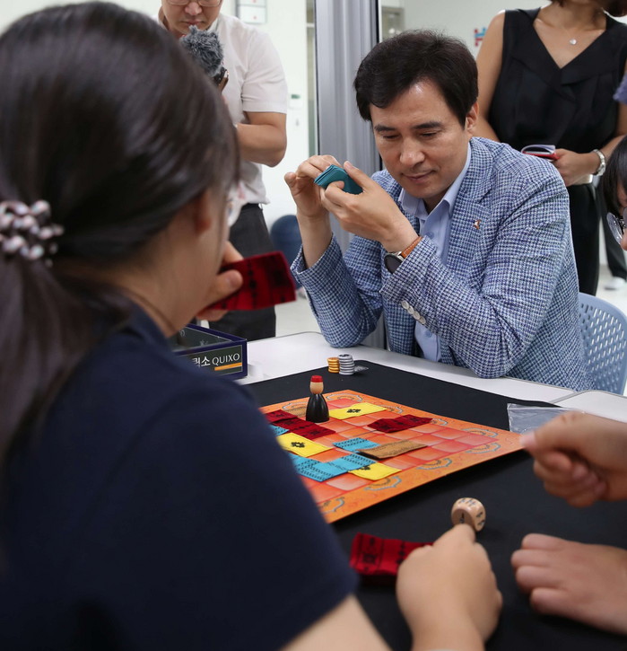 | ▲봉담아동청소년센터를 방문한 서철모 화성시장이 이용 학생들과 함께 보드게임을 하고 있는 모습. |