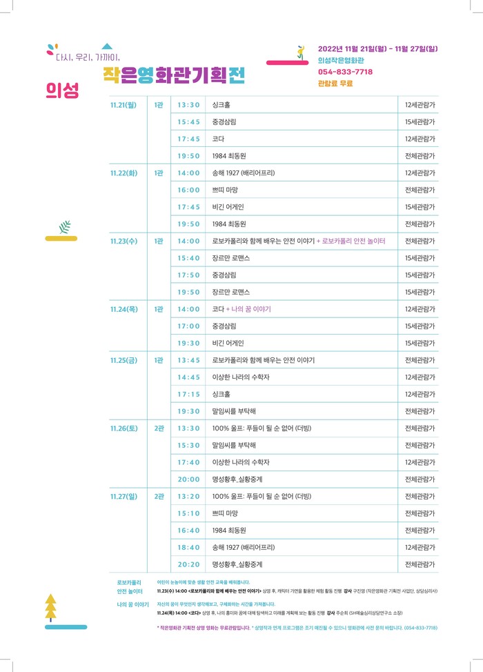 2021년 개관한 의성작은영화관에서 처음 열리는 '작은영화관 기획전'은 ㈜제이티미디어(JT)와 한국작은영화관협회가 주관하여 7개 부문 13편의 영화(28회) 무료 상영과 상영 영화와 연계된 교육 프로그램(2회)으로 구성된다. 대표적으로 '싱크홀', '중경삼림', '송해 1927(배리어프리)', '명성황후_뮤지컬 실황중계' 등 다채롭고 흥미로운 영화로 관객들을 만나고자 한다.
