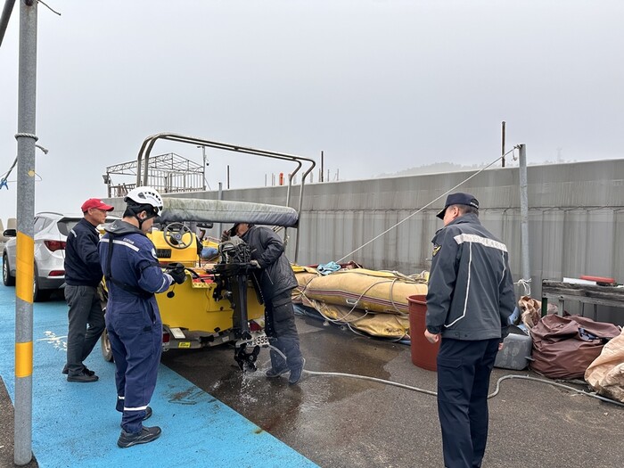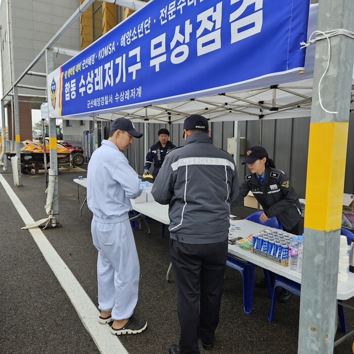 ▲ 지난 23년에 군산시 오식도동 비응항 해양소년단 계류장(슬립웨이)에서 동력수상레저기구 무상점검을 실시했다.(군산해경 제공) |