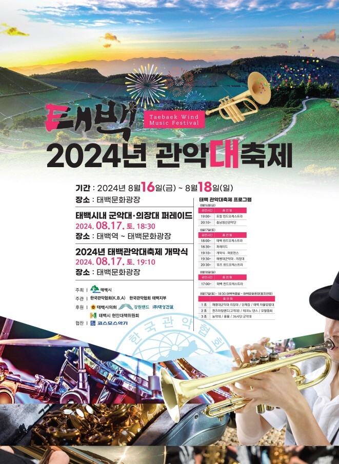 대한민국에서 가장 시원한 도시 태백에서 펼쳐지는 2024년 태백관악대축제에는 해병대군악의장대와 36사단 군악대, 국내 유슈의 윈드오케스트라 및 전문연주단이 참여하며, 거리퍼레이드를 비롯한 오케스트라 공연이 열린다.