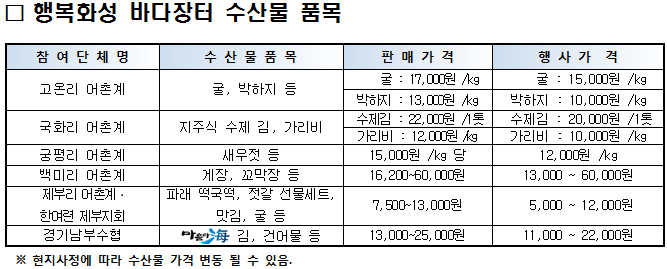 다음은 행복화성 바다장터 수산물 품목 안내표다.