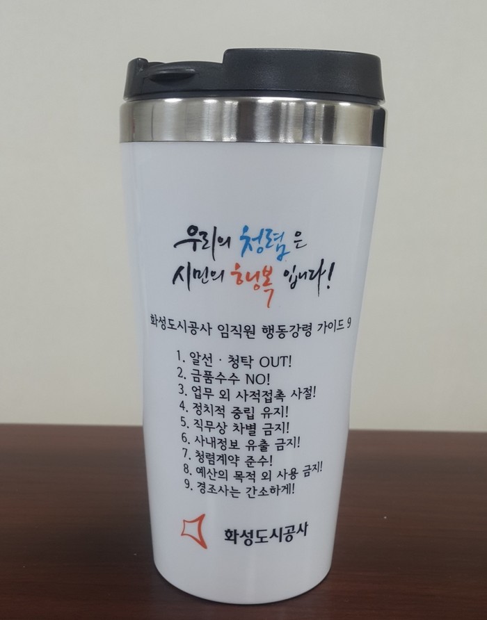 한편 화성도시공사는 이번 청렴텀블러 배부뿐만 아니라 지난 2월부터 매월 1일을 '청렴의 날'로 지정해 ‘전 임직원 청렴 메시지 발송 및 청렴퀴즈 풀이’, ‘부서별 청렴교육 및 청렴시책 발굴 토의’, ‘반부패‧청렴 수범사례 게시’ 등 다양한 청렴혁신 활동을 통해 윤리경영 실현에 힘쓰고 있다.