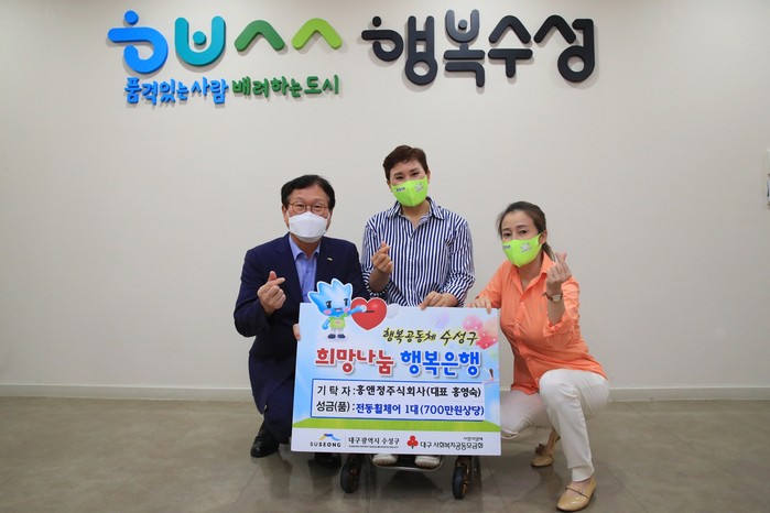 [로컬세계 박세환 기자]대구 수성구는 지난 3일 홍영숙 홍앤정주식회사 대표가 구청을 방문해 어려운 이웃을 위해 사용해 달라며 전동휠체어 1대를 전달했다고 4일 밝혔다.