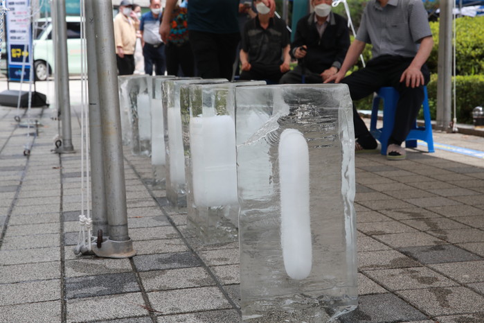 ▲관악구 선별진료소 대기줄 사이 더운 열기를 식혀줄 얼음이 놓여있다. 관악구 제공 |