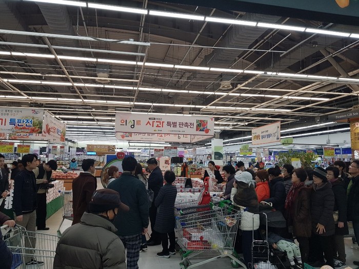 | ▲지난 11일부터 농협하나로클럽 성남점에서 3일간 의성진사과 특별 판촉전 모습.(의성군 제공)! |