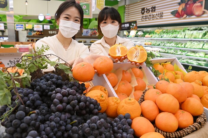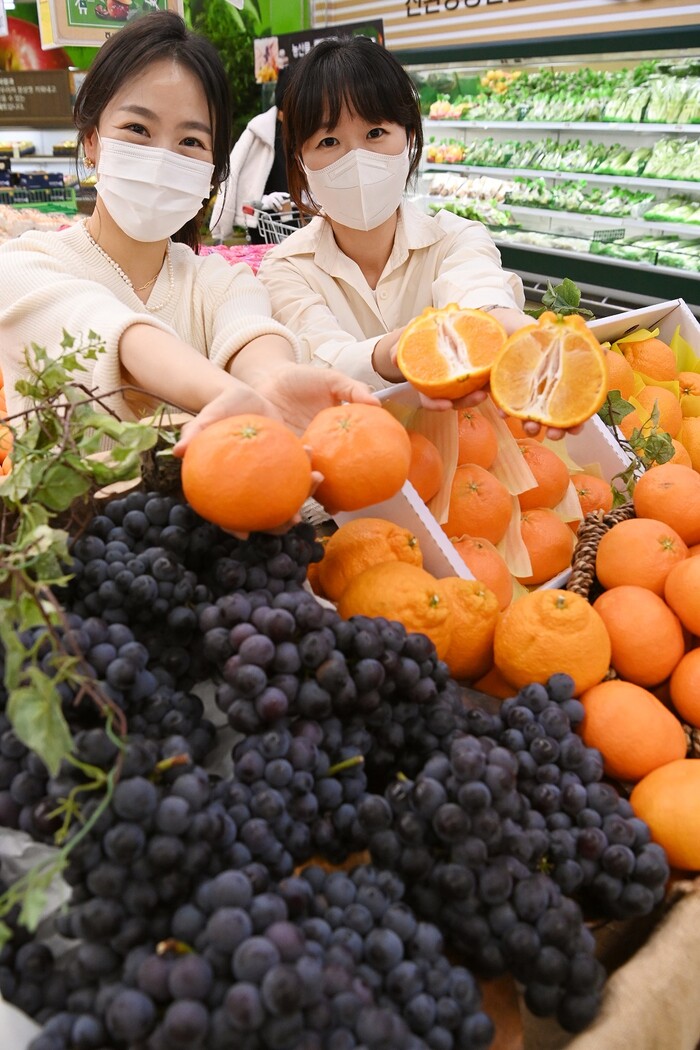 ▲ 27일(일) 서울시 서초구에 위치한 농협 하나로마트 양재점에서 모델들이 올해 첫 출하된 겨울과일인 한라봉 · 탄금향 · 세레단포도를 소개하고 있다. 농협유통 제공 |