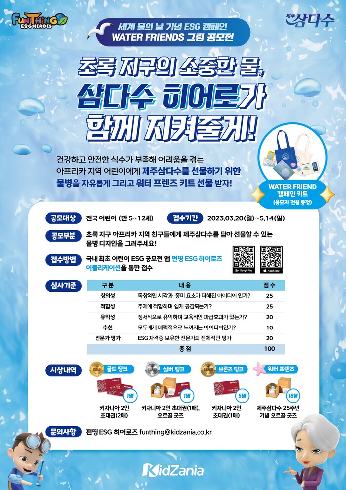 이번 ‘워터 프렌즈’ 그림 공모전은 온·오프라인을 통해 참여할 수 있다. 온라인 접수는 어린이 ESG 공모전 앱 ‘펀띵 ESG 히어로즈’에서 할 수 있으며, 키자니아 서울·부산 내 ‘ESG 플레이 본부’에서도 참여할 수 있다. 3월 20일부터 5월 14일까지 두 달 여간 진행되며, 만 5세에서 만 12세 이하 어린이 누구나 참여 가능하다.