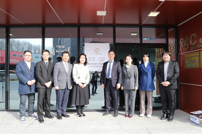 ▲이진희 국제관세협력국장(왼쪽에서 4번째)이 27일 음성군 소재 리안코스메틱스 업체 관계자들과 기념사진을 촬영하고 있다. 관세청 제공 |