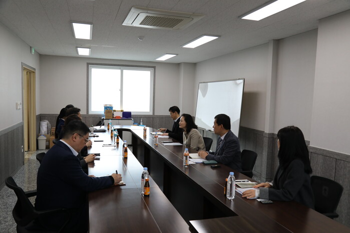 ▲ 이진희 국제관세협력국장(오른쪽 위 2번째)이 27일 음성군 소재 리안코스메틱스 업체 관계자들과 지원방안을 논의하고 있다. |