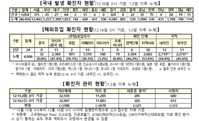 질병관리청 중앙방역대책본부(본부장:정은경 청장)는 16일 0시 현재, 국내발생 신규 확진자는 1054명이 확인됐고, 해외유입은 24명이 확인돼 총 누적 확진자수는 4만5442명(해외유입 4986명)이라고 밝혔다.