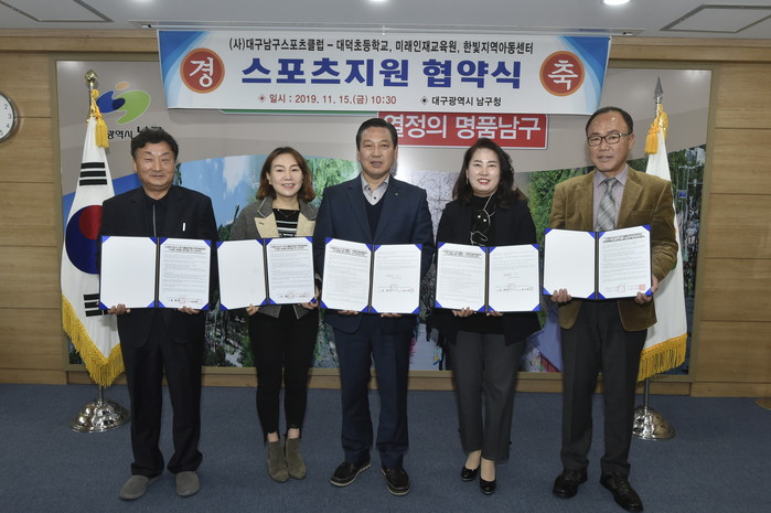 이날 협약식에는 대구남구스포츠클럽 회장인 조재구 남구청장을 비롯해 미래인재교육원 김미숙 대표, 대덕초등학교 임인오 교장, 한빛지역아동센터 박희정 센터장 등이 참석했다.