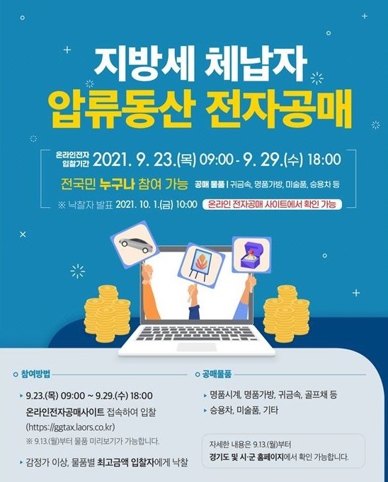 이번 공매는 온라인 전자공매 사이트에서 비대면으로 진행되며, 용인시를 비롯해 도내 22개 시‧군이 참여한다.
