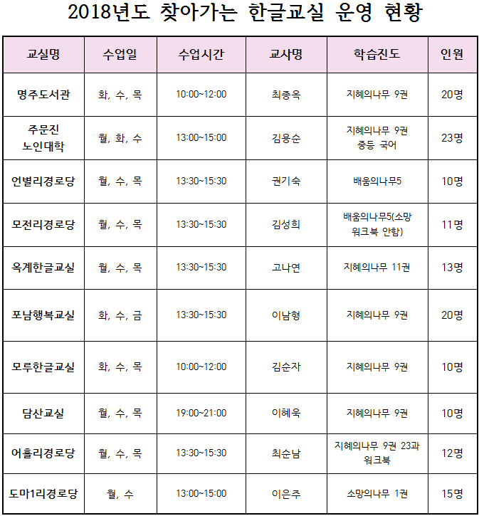▲2018년도 찾아가는 한글교실 운영 현황.(강릉시 제공) |